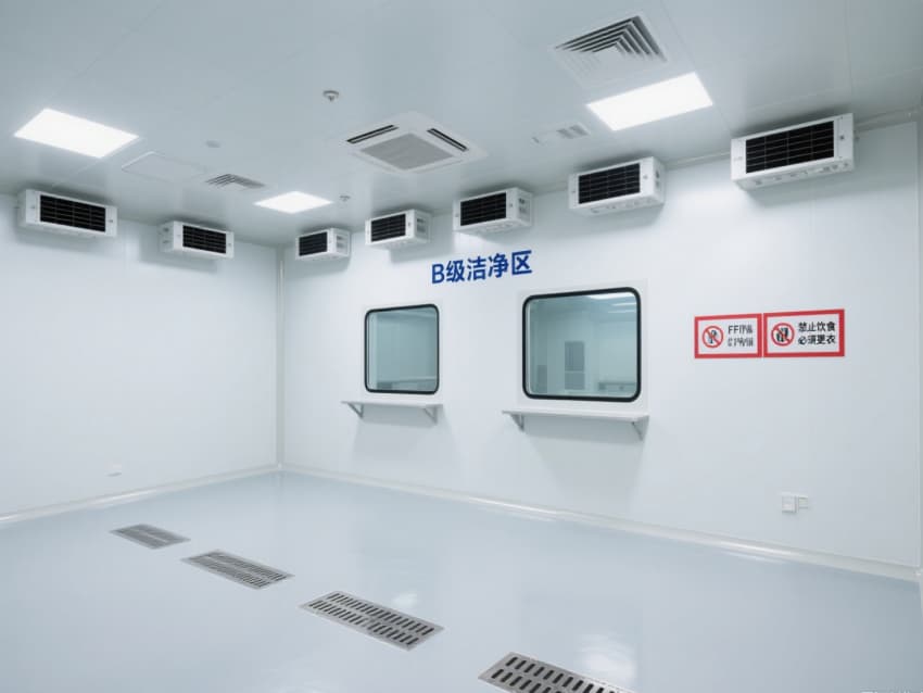 頂部嵌入式高效送風(fēng)口形成垂直層流,配合側(cè)下回風(fēng)系統(tǒng)實(shí)現(xiàn)每小時(shí)15-25次空氣置換,恒溫恒濕系統(tǒng)精準(zhǔn)控制溫度(18-26℃)、濕度(45-65%)。不銹鋼潔凈門窗與傳遞窗采用高氣密性密封結(jié)構(gòu),嵌入式LED潔凈燈提供≥300lux均勻照明,全方位營(yíng)造安全、精準(zhǔn)的生物制藥生產(chǎn)基礎(chǔ)環(huán)境。