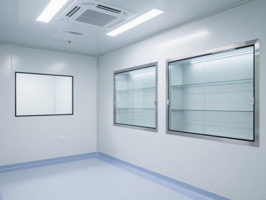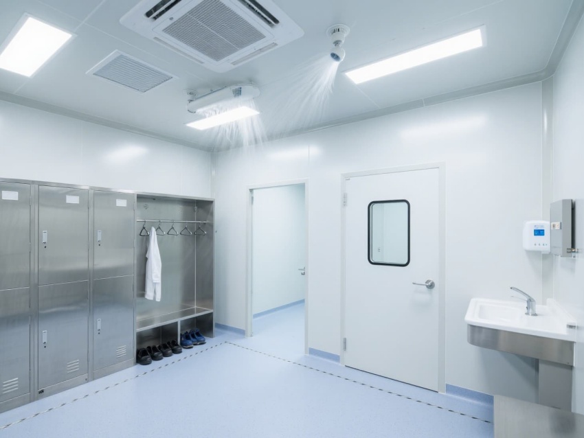 實驗室以白色抗菌彩鋼板構建墻體與吊頂,搭配淺藍灰色防靜電環(huán)氧地坪,整體色調簡潔明快。墻面與地面的圓弧角設計避免積塵,便于高頻次消毒清潔。頂部高效過濾器形成單向流氣流,每小時15-20次空氣置換,維持室內正壓以防外界污染。?